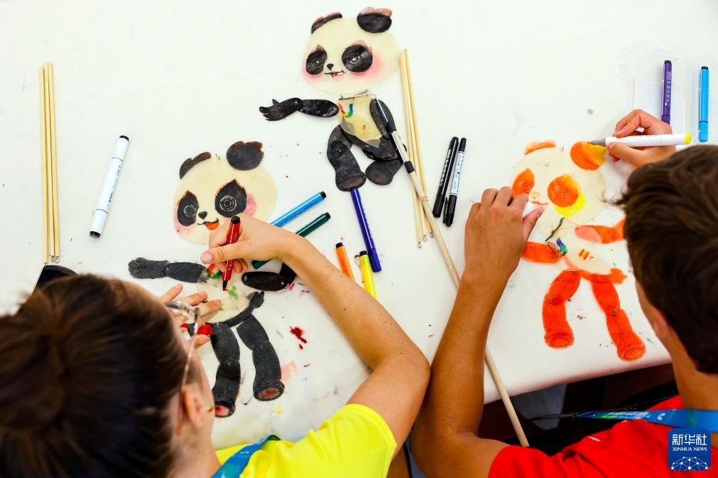 8月2日,在成都大運村的互動體驗中心,西班牙運動員在繪製熊貓造型的皮影道具。