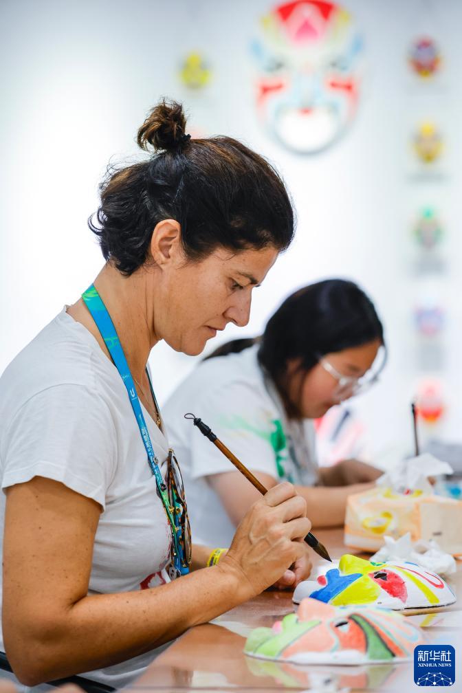 8月2日,在成都大運村的互動體驗中心,意大利代表團成員費代麗卡·弗雷迪亞尼(左)繪製中國戲劇臉譜。