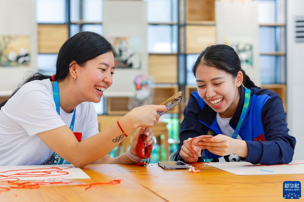 8月3日,在成都大運村的互動體驗中心,吉爾吉斯斯坦運動員卡妮柯(左)拍攝隊友阿扎爾製作香包的過程。