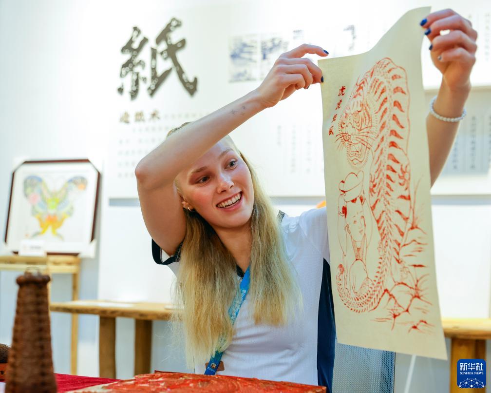8月3日,在成都大運村的互動體驗中心,芬蘭運動員傑茜卡·卡哈拉展示自己製作的夾江年畫。