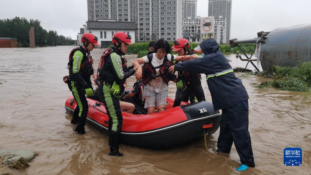 8月4日,在尚志市中心城區,哈爾濱市森林消防支隊的消防員正在解救被困村民。