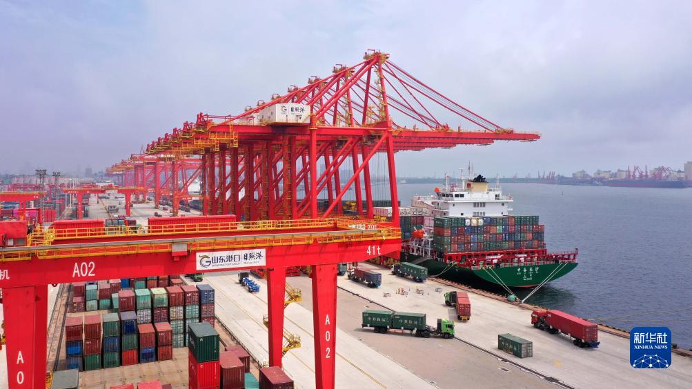 8月4日,在山東港口日照港集裝箱碼頭,貨輪靠泊卸載集裝箱(無人機照片)。