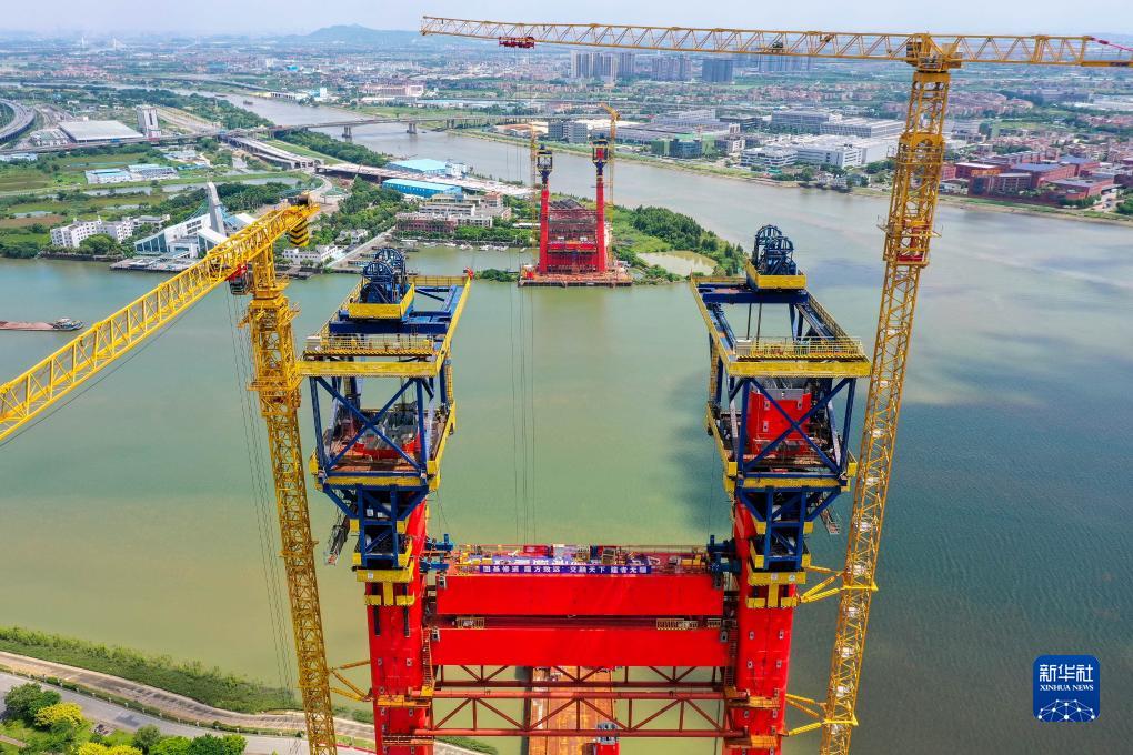 已經完成上橫樑吊裝的順德大橋西主塔(無人機照片,8月4日攝)。