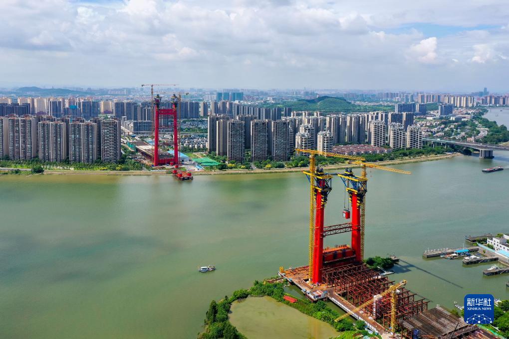 建設中的順德大橋雙主塔(無人機照片,8月4日攝)。