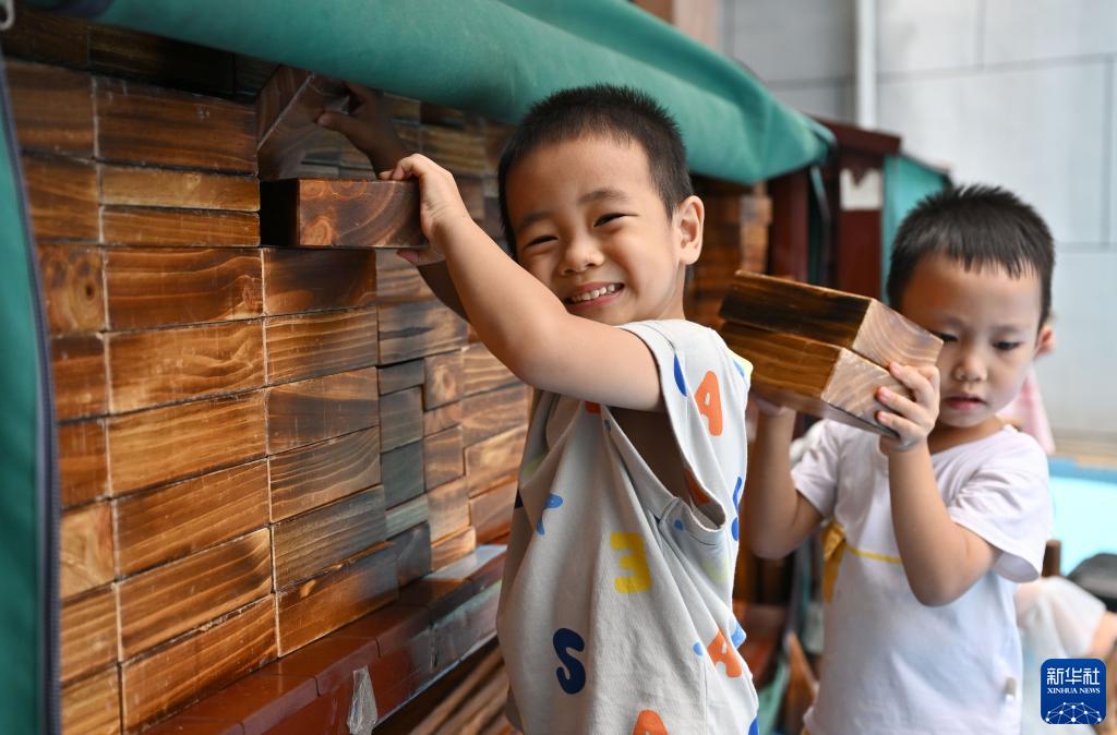 8月4日,參加暑期託管的小朋友在海口一家幼兒園玩積木。