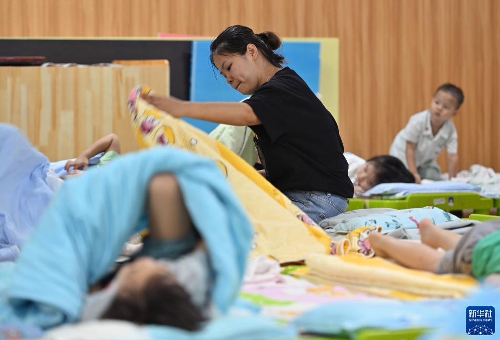 8月4日,海口一家幼兒園的老師帶着參加暑期託管的小朋友午休。