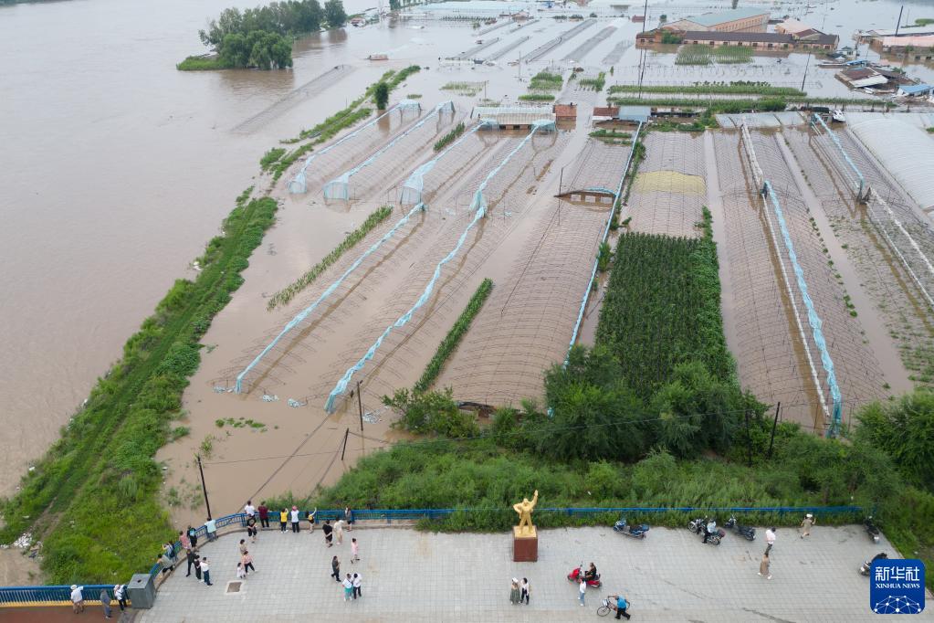 8月4日,人們在黑龍江省牡丹江市鐵嶺河牡丹江公路大橋觀察水情(無人機照片)。