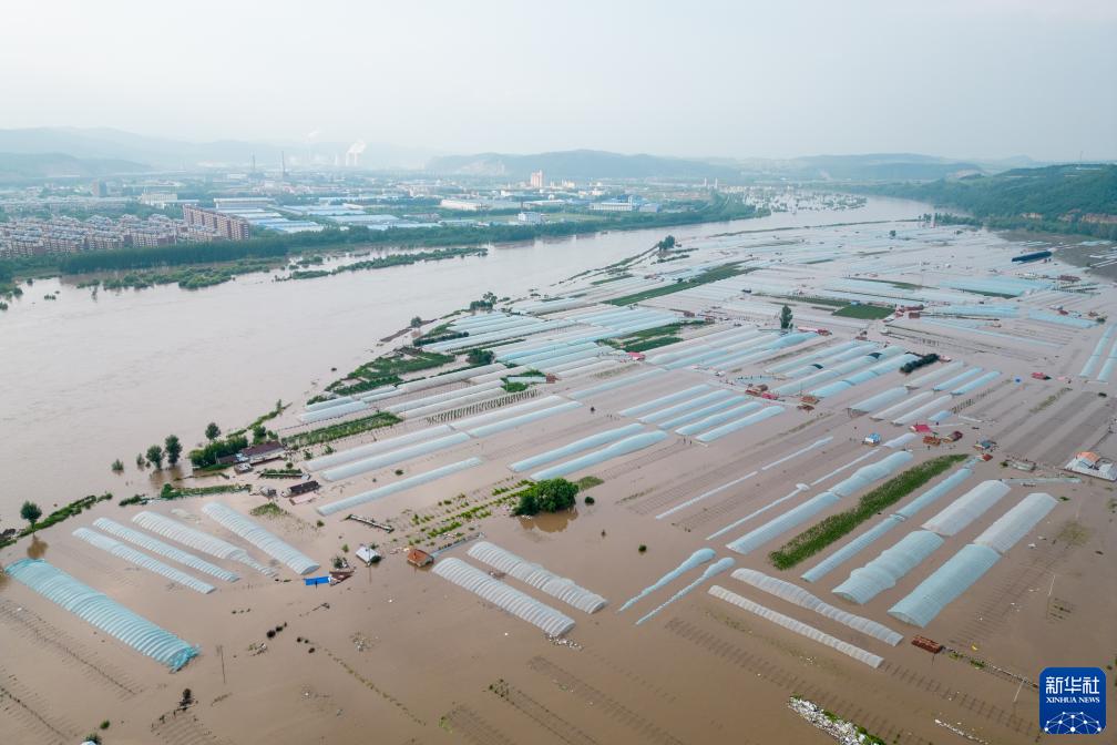 這是8月4日拍攝的黑龍江省牡丹江市鐵嶺河牡丹江公路大橋段被淹的房屋和大棚(無人機照片)。