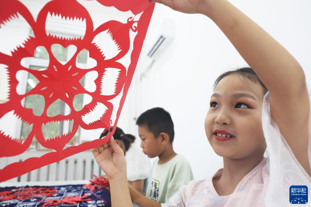 8月4日,在河北省唐山市豐潤區燕山路街道建華二社區暑托班上,小朋友在檢查自己的剪紙作品。