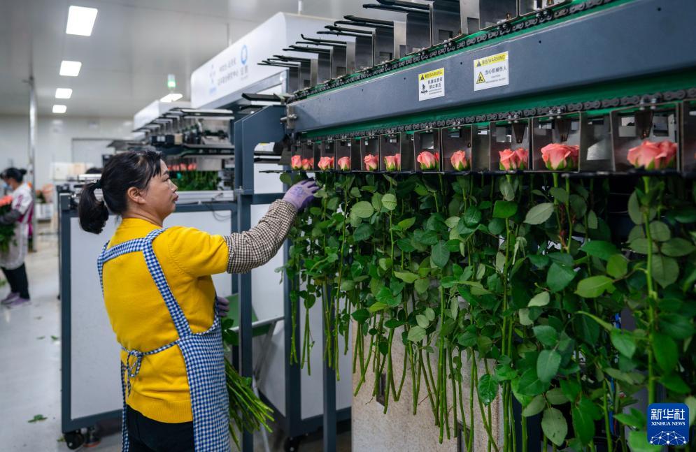 在雲天化晉寧花卉産業現代化示範園內,一名花農將分揀好的鮮花放入包裝流水線進行包裝(7月12日攝)。新華社記者 陳欣波 攝