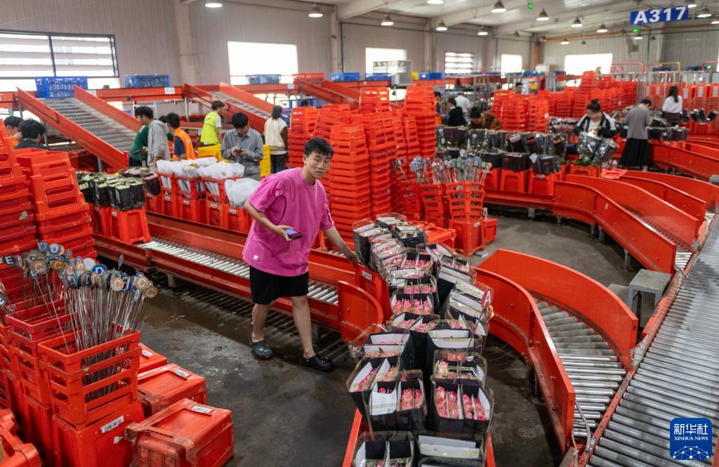 在昆明國際花卉拍賣交易中心,一名質檢員將質檢分級後的鮮花推入傳送帶(7月13日攝)。新華社記者 陳欣波 攝
