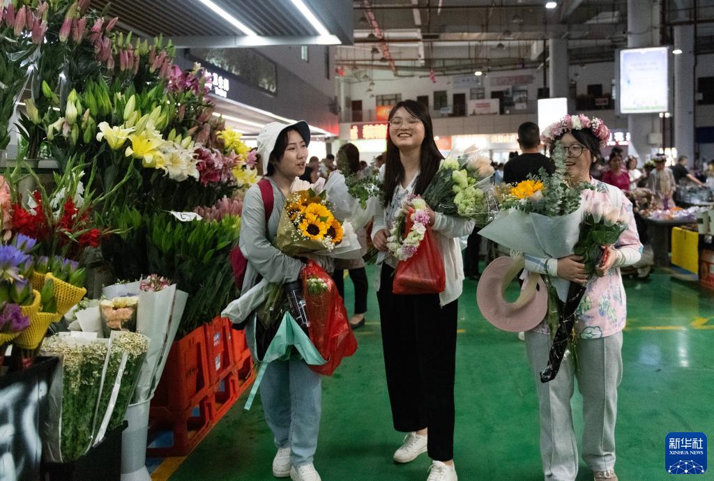 幾名外地游客在昆明鬥南花卉市場內購買鮮花(7月13日攝)。新華社記者 陳欣波 攝