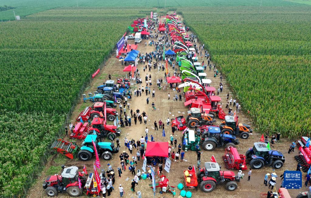 8月4日拍攝的“農機地頭展——2023年河北農機新機具新技術推廣演示會”現場(無人機照片)。