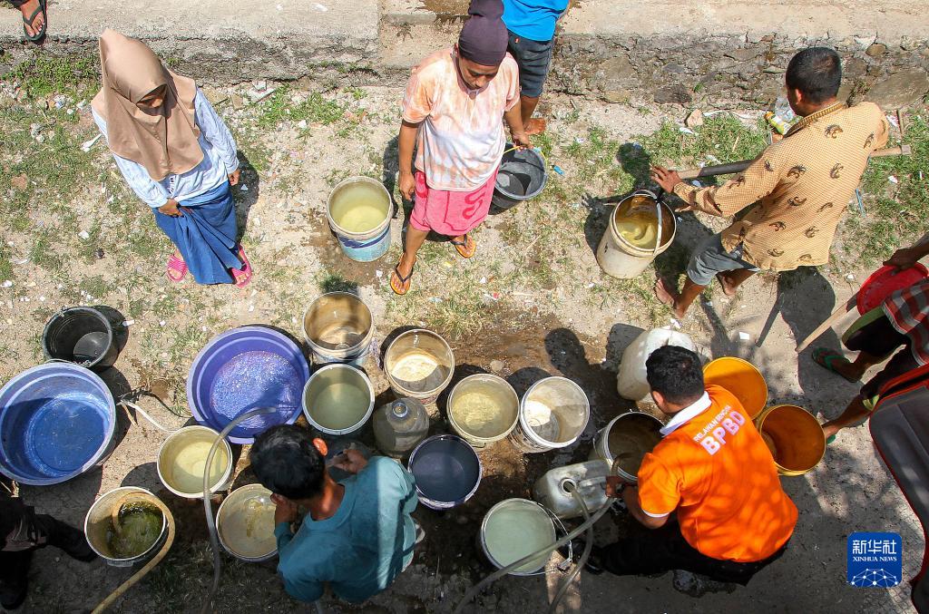 8月3日,在印度尼西亞西爪哇省茂物,人們在送水車前排隊等候打水。