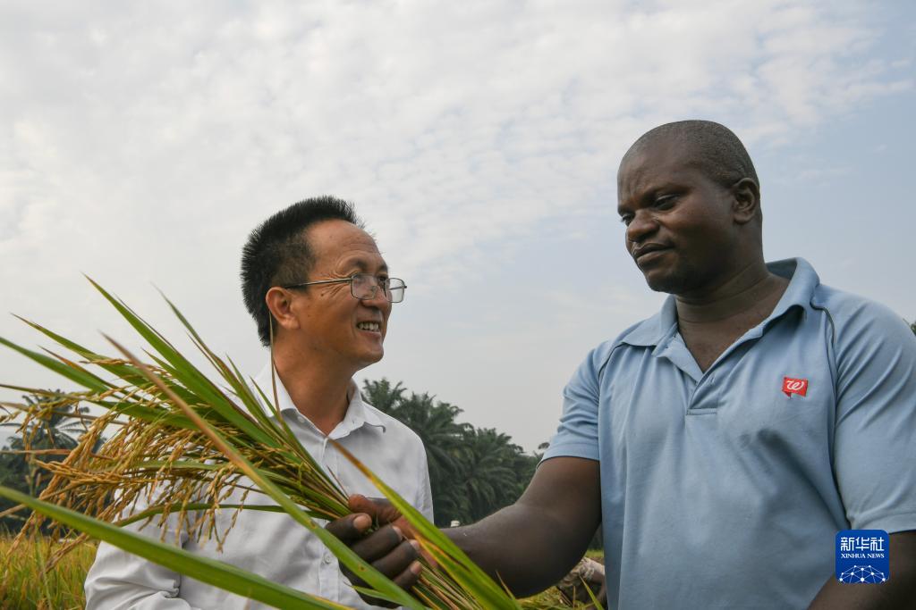 6月20日,在布隆迪布班扎省吉漢加縣,中國農業專家組組長楊華德(左)在稻田間和夏爾交流。
