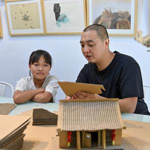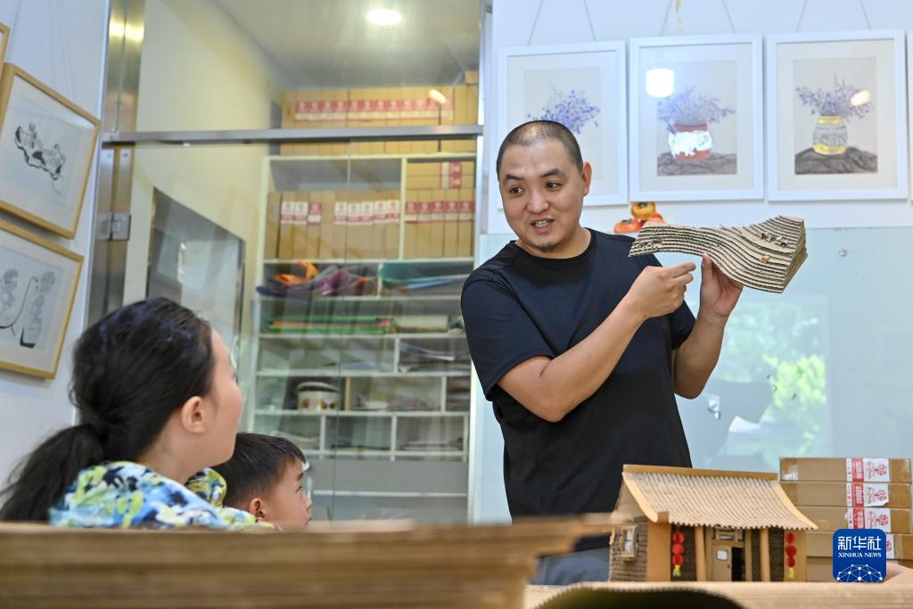 在位於山西省太原市萬柏林區的工作室內,王帥棟和小朋友們分享瓦楞紙作品背後的地理知識(8月4日攝)。