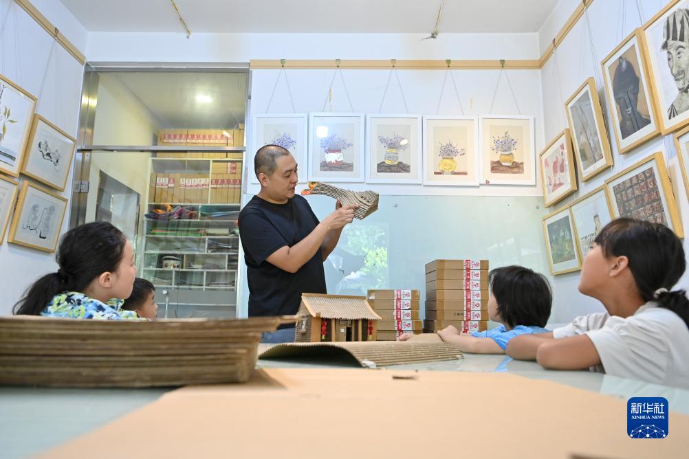 在位於山西省太原市萬柏林區的工作室內,王帥棟和小朋友們分享瓦楞紙作品背後的地理知識(8月4日攝)。