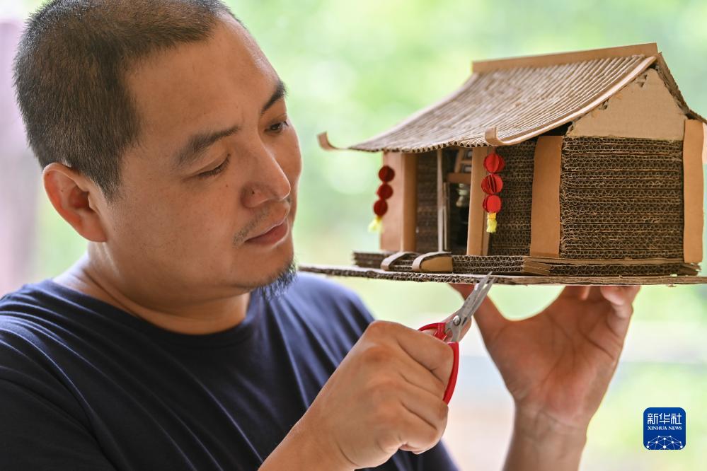 王帥棟在位於山西省太原市萬柏林區的工作室內修整瓦楞紙作品(8月1日攝)。