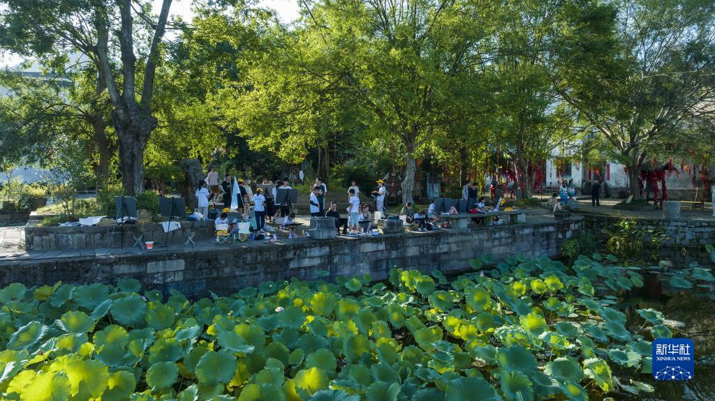 8月4日,游客在黃山市徽州區呈坎古村寫生。