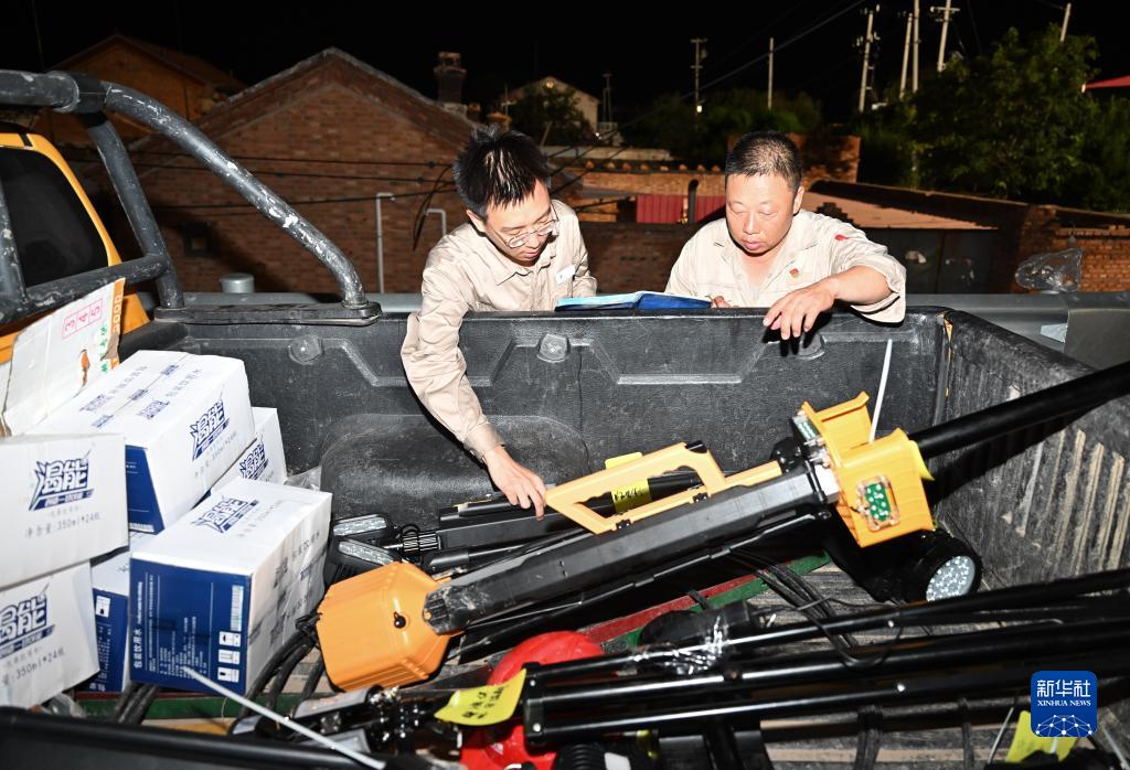 8月4日,國網天津電力工程搶險人員在天津市靜海區&頭鎮現場核對應急照明燈具準備情況。