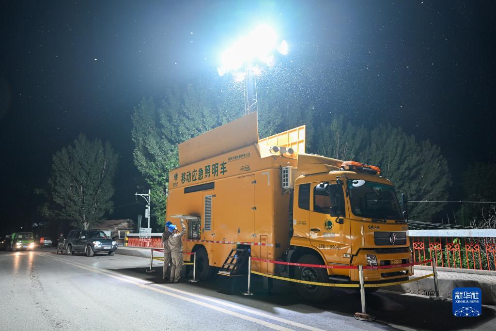 8月4日,國網天津電力移動應急照明車在天津市靜海區&頭鎮革命橋上為岸堤作業人員及巡堤人員提供移動應急照明保障。