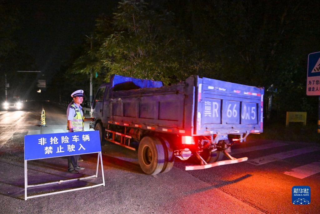 8月4日,天津市公安局靜海分局執勤交警在&頭鎮入鎮卡口處指揮搶險車輛進入。