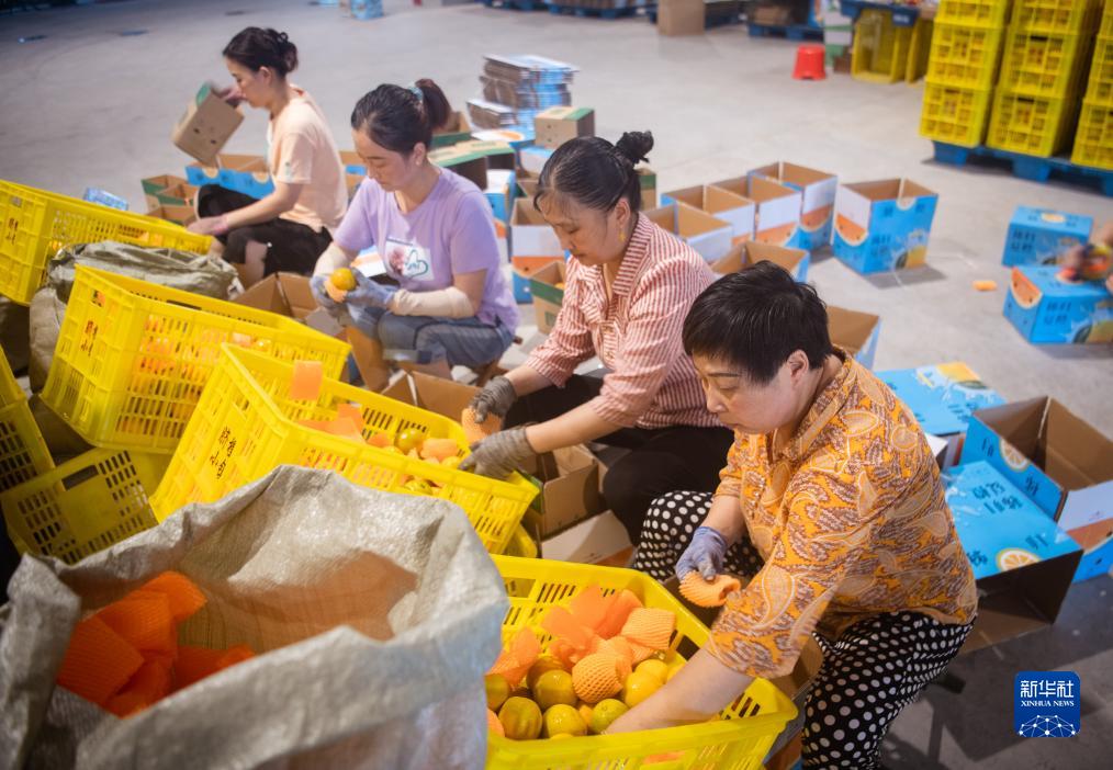 8月4日,在秭歸縣臍橙文旅小鎮數字化電商中心,工作人員將夏橙裝箱。