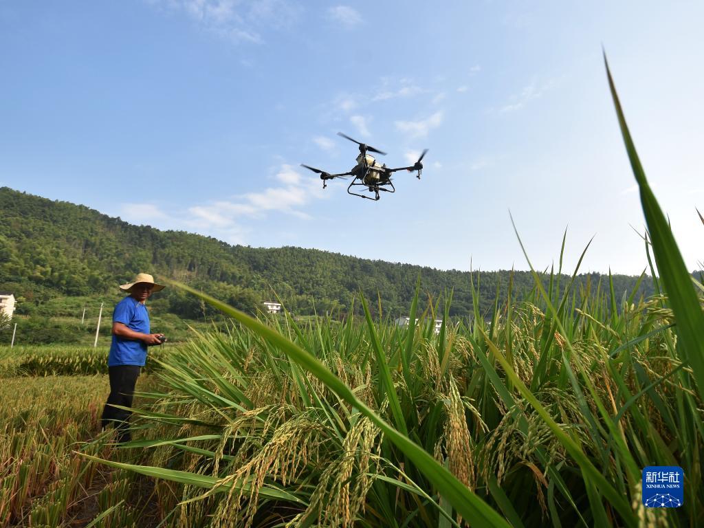 8月5日,在湖南省婁底市雙峰縣石牛鄉上茶村,技術人員操作植保無人機為水稻噴葉面肥。