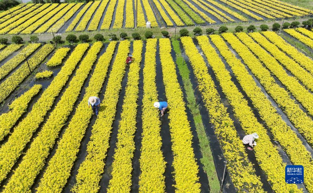 8月5日,在浙江省湖州市德清縣雷甸鎮雙溪村苗木種植基地,農民在管護苗木(無人機照片)。