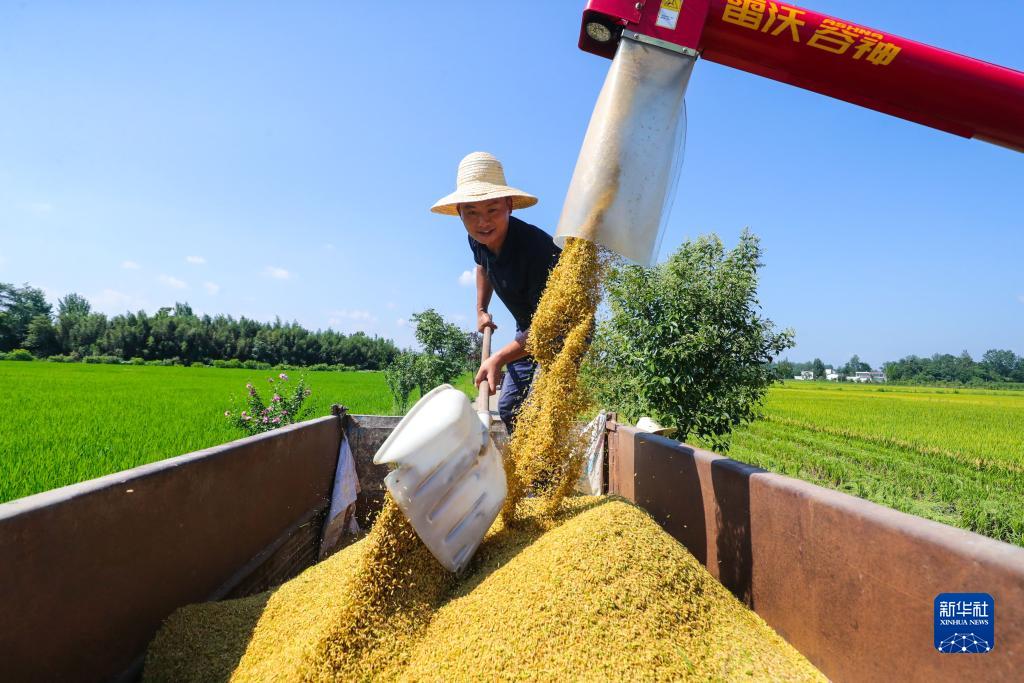 8月4日,河南省信陽市光山縣南向店鄉何畈村鑫磊合作社社員在搶收頭茬再生水稻。