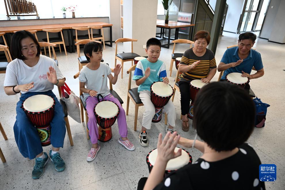 8月5日,市民在藝術課堂上學習非洲鼓演奏。