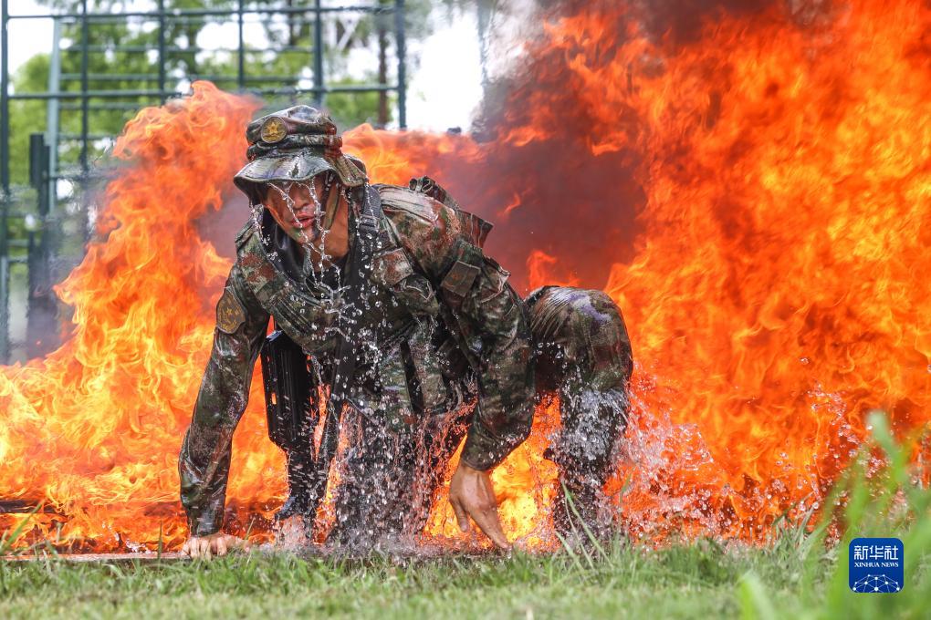 陸軍第72集團軍某旅組織官兵進行極限課目訓練,一名戰士穿越火障(7月30日攝)。