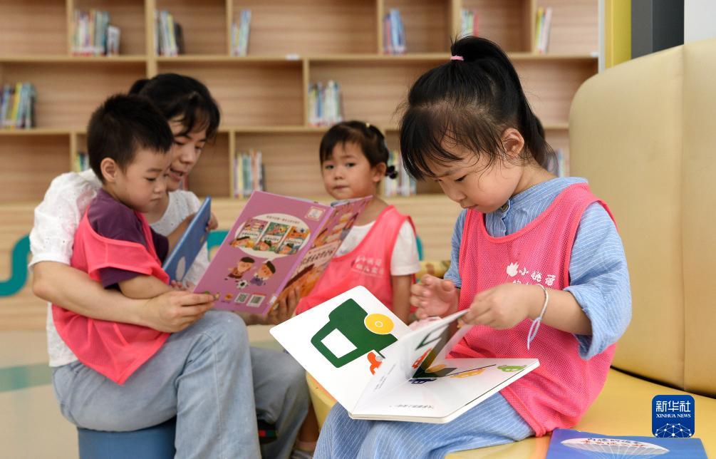 在陜西省圖書館高新館區,一家幼兒園的老師帶領孩子一起閱讀繪本(8月4日攝)。