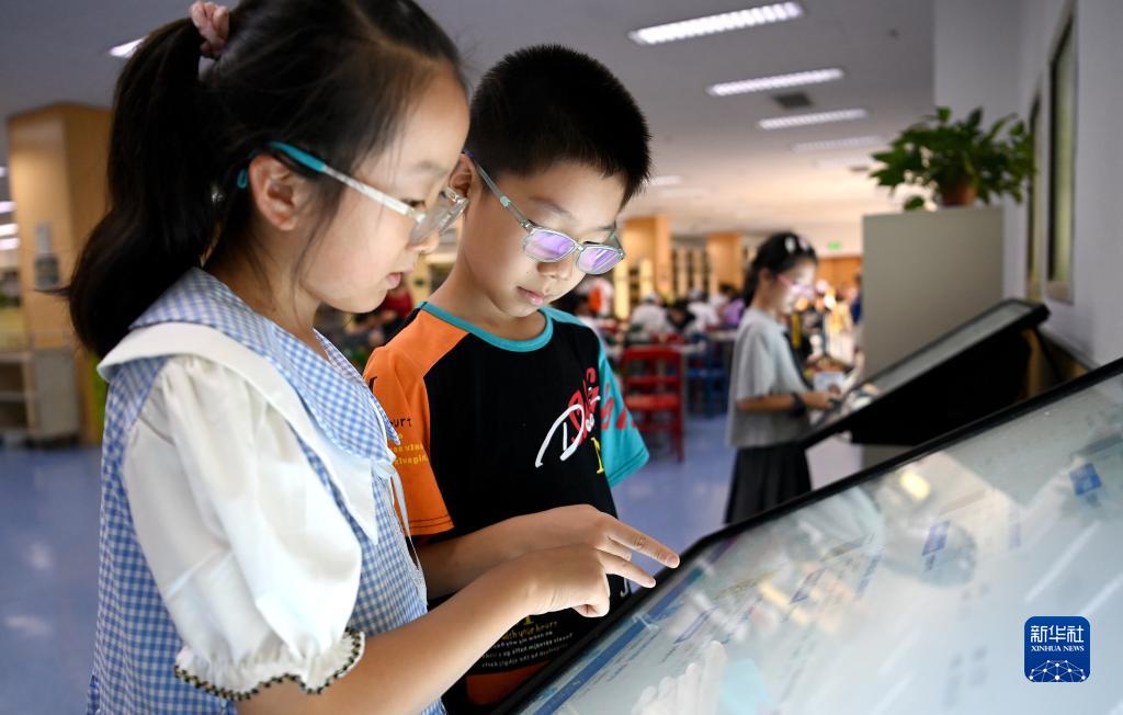 兩名兒童在陜西省圖書館長安路館區查閱圖書(8月4日攝)。