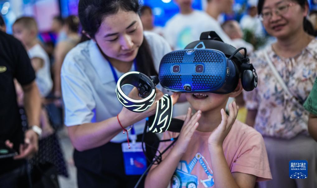 8月5日,小朋友在使用VR設備體驗“橋旅融合”。