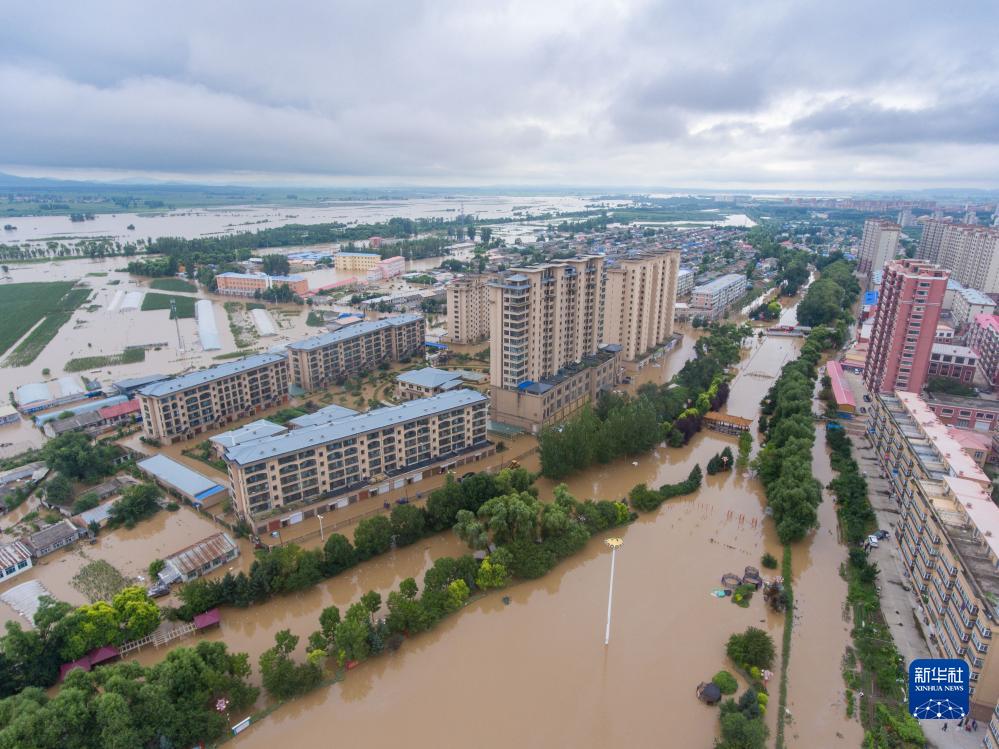 黑龍江省哈爾濱市延壽縣部分縣城被淹(8月5日攝,無人機照片)。