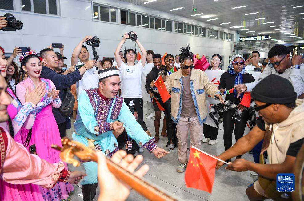 在烏魯木齊地窩堡國際機場,新疆藝術劇院木卡姆藝術團的演員盛情起舞,歡迎抵達的南非舞蹈演員(7月24日攝)。