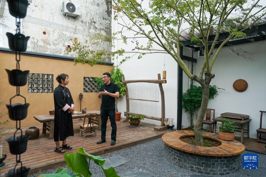 在蘇州市樹山村一家民宿內,鄉村規劃師彭銳(右)和民宿主理人俞慧在聊天交流(7月14日攝)。