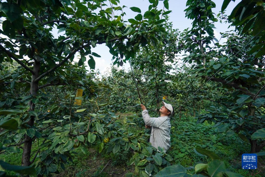 農戶在蘇州市樹山村梨園內採摘翠冠梨(8月3日攝)。