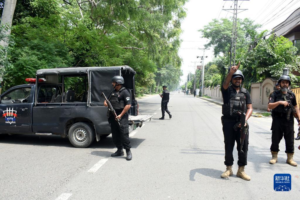 8月5日,警察在伊姆蘭·汗位於巴基斯坦東部旁遮普省首府拉合爾的私邸附近警戒。
