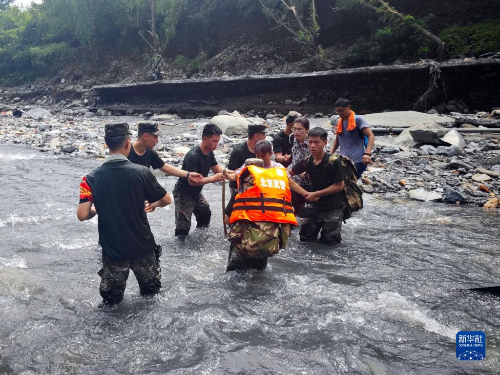 武警北京總隊機動第二支隊官兵在北京市房山區史家營鄉楊林水村轉移受災群眾(8月4日攝)。新華社發(楊洋 攝)