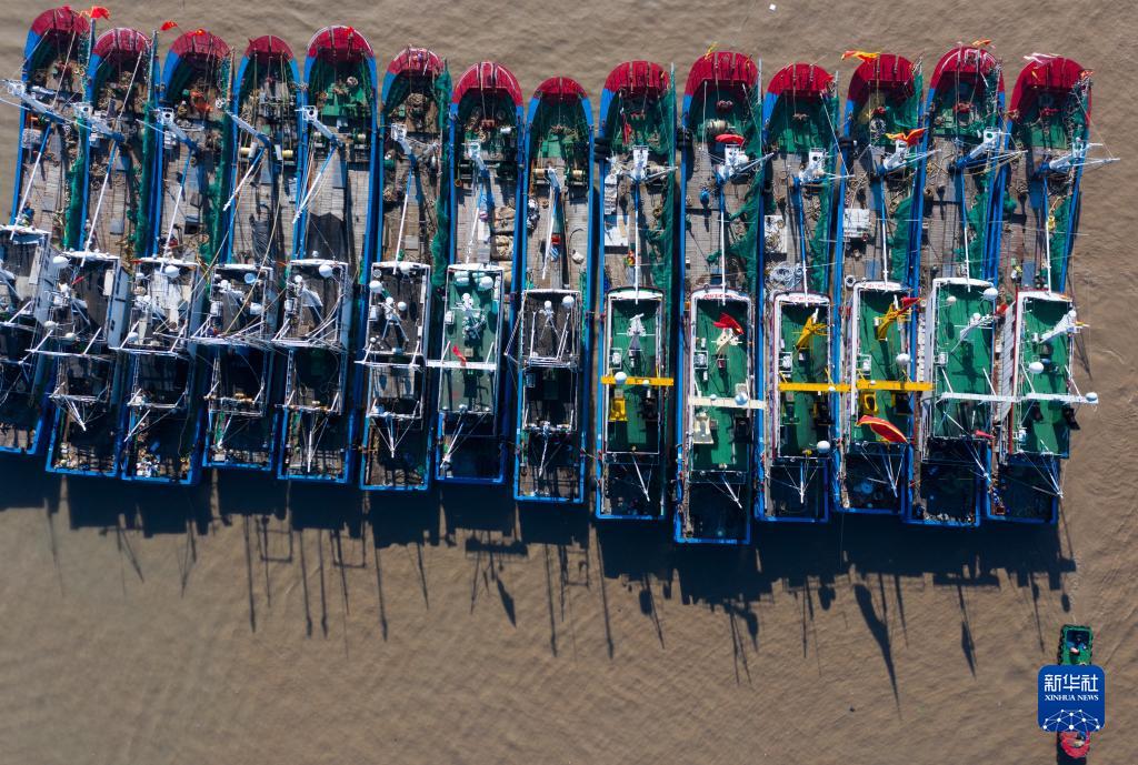 8月6日,停泊在舟山普陀沈家門漁港的漁船即將出港(無人機照片)。