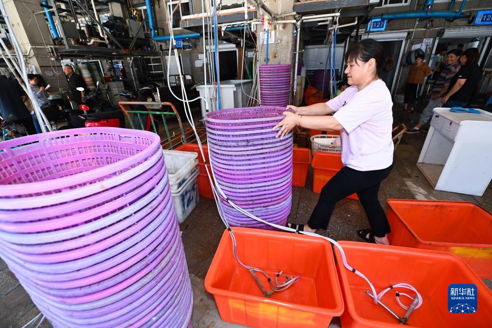 8月6日,舟山國際水産城海鮮活品經營戶在為迎接開漁後首批漁獲做準備工作。