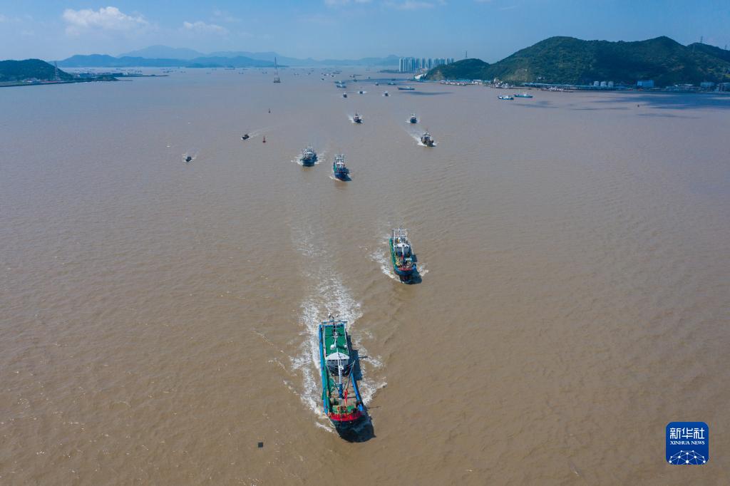 8月6日,漁船從舟山普陀沈家門漁港駛出,前往東海漁場(無人機照片)。