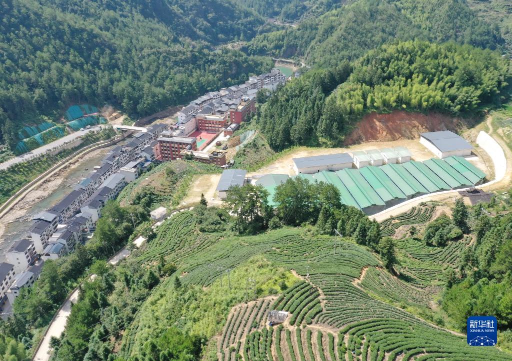8月5日拍攝的壽寧縣下黨鄉下黨村村貌、有機珍稀食用菌生産基地(右)和附近的茶山景觀(無人機照片)。