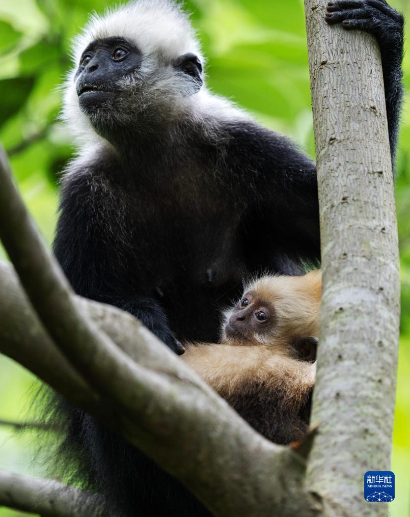 一隻白頭葉猴抱着幼猴覓食(8月4日攝)。
