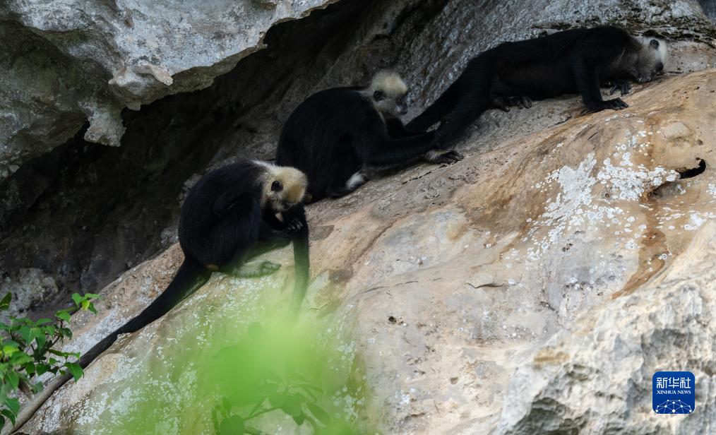 白頭葉猴,頭頂高聳着一撮白毛,是我國特有的國家一級重點保護野生動物,種群數量稀少,主要分佈在廣西崇左市左江和明江之間約200平方公里的喀斯特石山地區。白頭葉猴還有個好聽的名字——“石山精靈”。