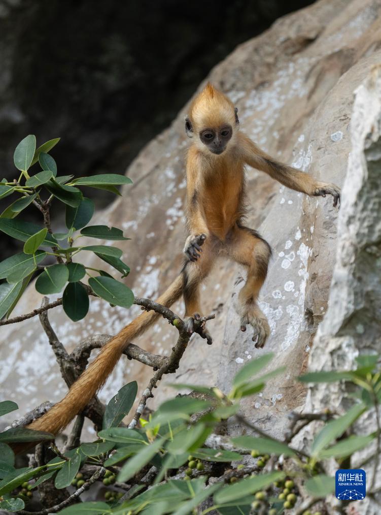 白頭葉猴,頭頂高聳着一撮白毛,是我國特有的國家一級重點保護野生動物,種群數量稀少,主要分佈在廣西崇左市左江和明江之間約200平方公里的喀斯特石山地區。白頭葉猴還有個好聽的名字——“石山精靈”。