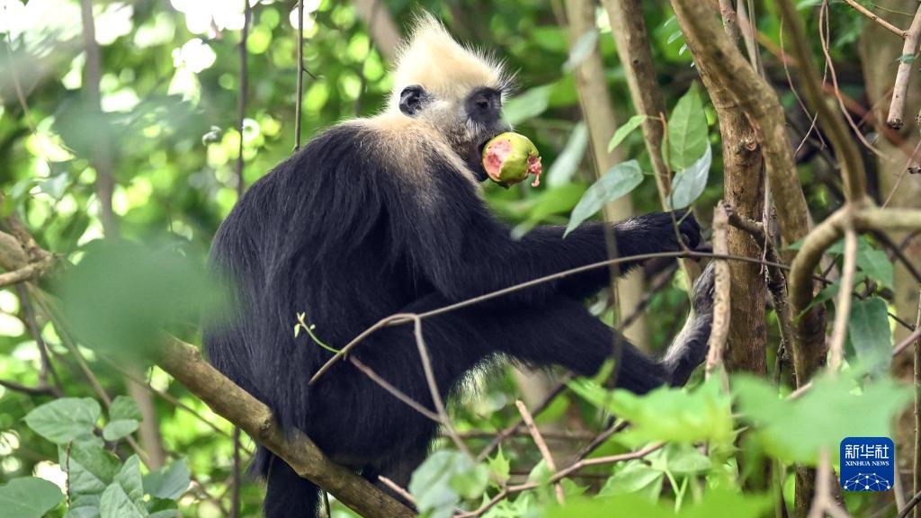 白頭葉猴,頭頂高聳着一撮白毛,是我國特有的國家一級重點保護野生動物,種群數量稀少,主要分佈在廣西崇左市左江和明江之間約200平方公里的喀斯特石山地區。白頭葉猴還有個好聽的名字——“石山精靈”。