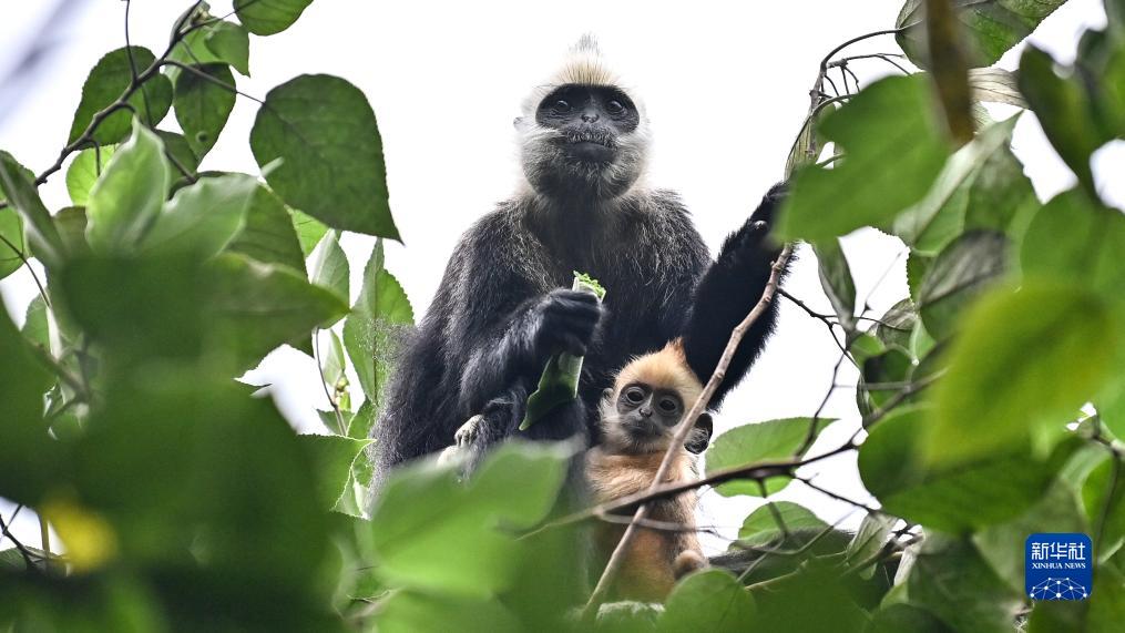 一隻白頭葉猴帶着幼猴覓食(8月4日攝)。